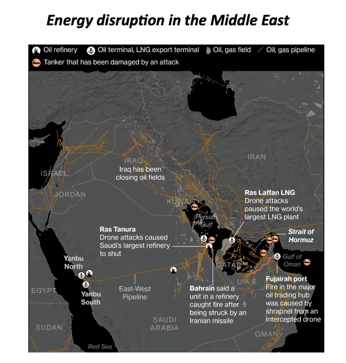 The ongoing war between the United States, Israel, and Iran has injected a substantial geopolitical risk premium into global energy markets, materially altering oil price dynamics. The Strait of Hormuz, which facilitates roughly one-fifth of global crude flows, represents a critical chokepoint in the global energy system. Its effective disruption as well as damage to critical energy infrastructure have transformed what was once a regional flashpoint into a structural supply shock with far-reaching implications for global trade and inflation.