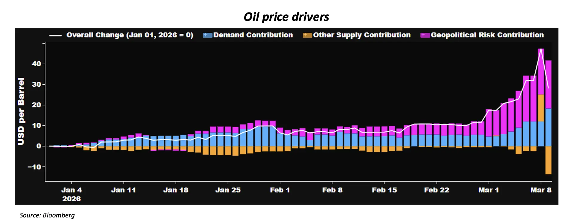 The US dollar has exhibited clear haven characteristics, with the DXY rising around 1% since pre-war. Despite recurring debates over its safe-haven status, the greenback continues to benefit from its reserve currency role, particularly given the nature of the shock. Meanwhile, fixed-income markets initially exhibited a more complex response, oscillating between safe-haven demand and inflation repricing. Elevated geopolitical tensions compressed yields via flight-to-quality flows but shortly afterwards, higher inflation expectations exerted upward pressure on yields, with the US 10-year yield currently at 4.09%, up roughly 15 basis points since pre-war.